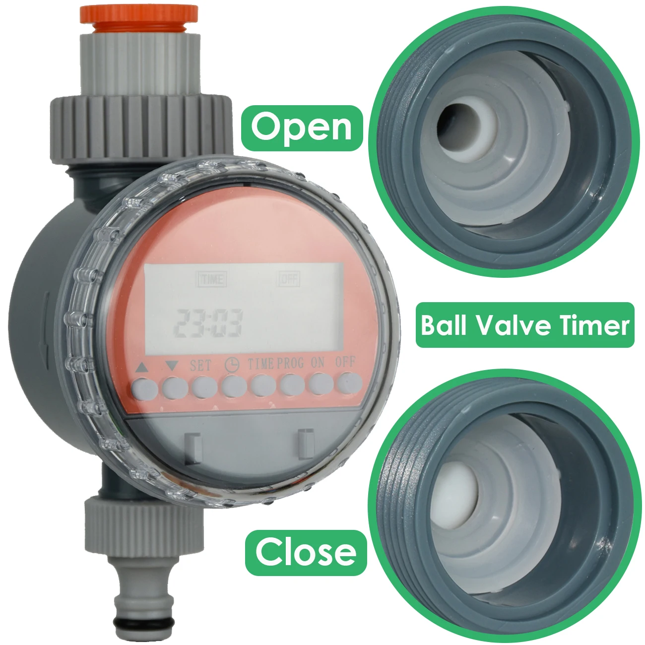 Irrigation time: if you need to irrigate every day, set to be 01, if you need to irrigate once every two days, set to be 02, and so on. The longest setting is to irrigate once every 30days.Press “SET” to confirm and end the first.Then it will automatically move to the second mode and so on. You can set 8 modes at once. That means you can set to irrigate at 8 different time intervals in one day. If you need to end setting, press closed.